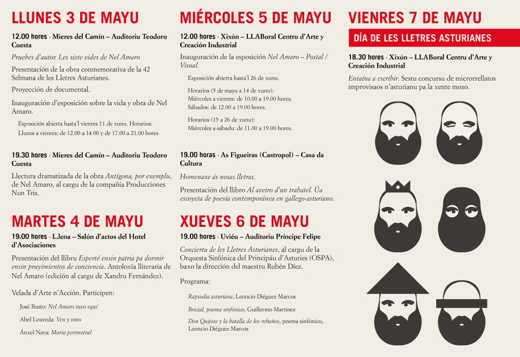 La 42 Selmana de les Lletres Asturianes celébrase ente’l 3 y 7 de mayu baxo’l lema Nel Amaro, la voz comprometida y rinde homenaxe al escritor y artista mierense coincidiendo colos diez años de la so muerte. La programación xira alredor de l’actividá creadora d’Amaro y reivindica la so figura humana y artística con un documental, dos publicaciones y dos esposiciones.