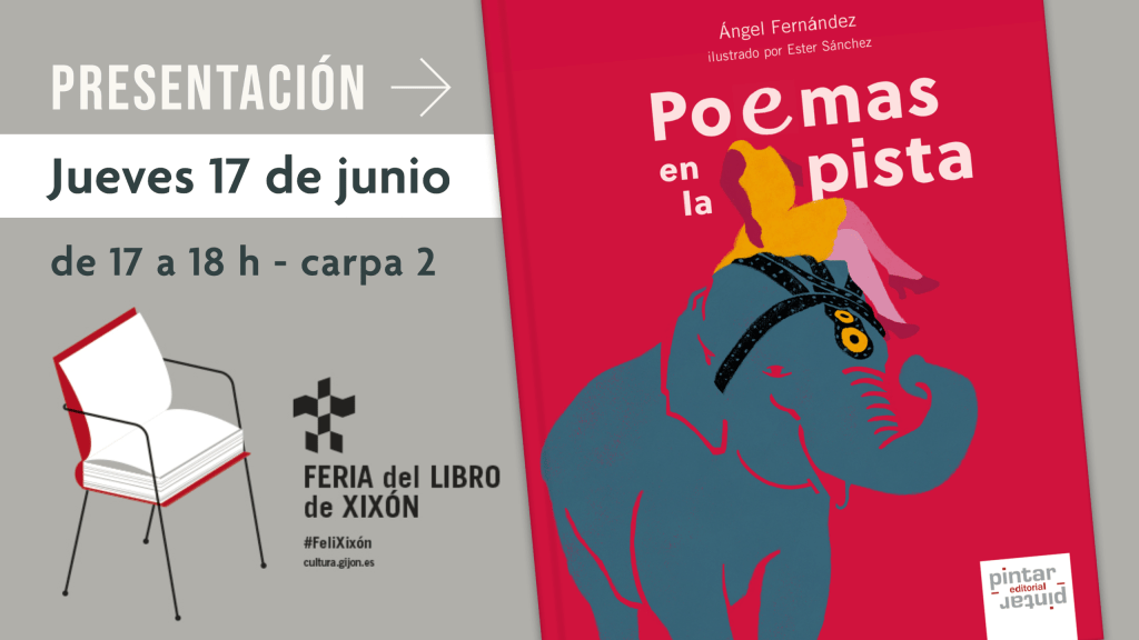 El jueves 17 de junio a las 17 h presentará en la Feria del Libro de Xixón en la carpa 2, Poemas en la pista editado por Pintar-Pintar, un poemario ilustrado que reaviva el misterio del circo clásico por el que desfilan leones, domadores o contorsionistas. Todo, ante una niña que sueña, sin perder detalle, alentada por la voz de su madre. Le acompañará Ester Sánchez editora y autora de las ilustraciones.