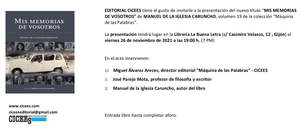 La presentación tendrá lugar el viernes 26 de noviembre a las 19 horas en la Librería «La Buena Letra». Situada en la calle Casimiro Velasco, 12 de Gijón.