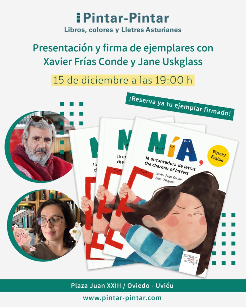 El próximo jueves 15 de diciembre a las 19:00 h, Xavier Frías Conde y Jane Uskglass presentarán en Pintar-Pintar (Plaza Juan XXIII – Oviedo) su nuevo álbum infantil ilustrado, editado en versión bilingüe español / english, Nía, la encantadora de letras / Nia, the charmer of letters