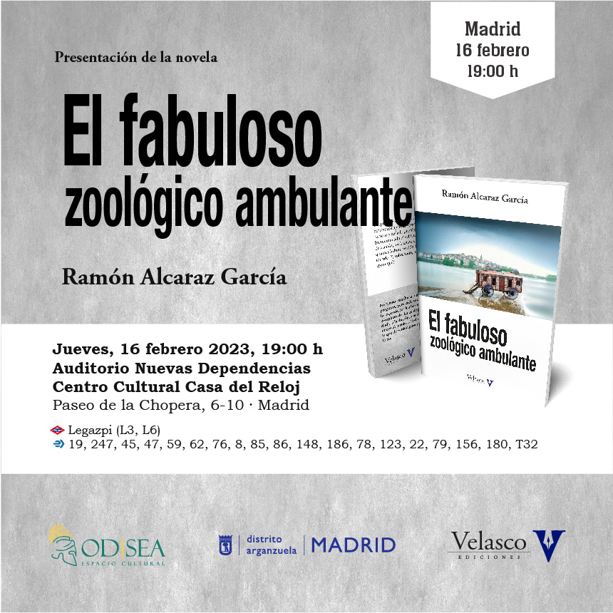 El jueves 16 de febrero, el escritor cartagenero Ramón Alcaraz presenta en Madrid la novela El fabuloso zoológico ambulante (Velasco Ediciones).