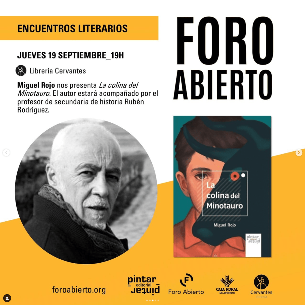 El próximo jueves, 19 de septiembre, te esperamos en la Librería Cervantes de Oviedo a las 19:00 horas, en la presentación de la nueva novela juvenil La colina del Minotauro, escrita por el Miguel Rojo (Pintar-Pintar Editorial). Acompañará y presentará al autor Rubén Rodríguez, profesor de Educación Secundaria.