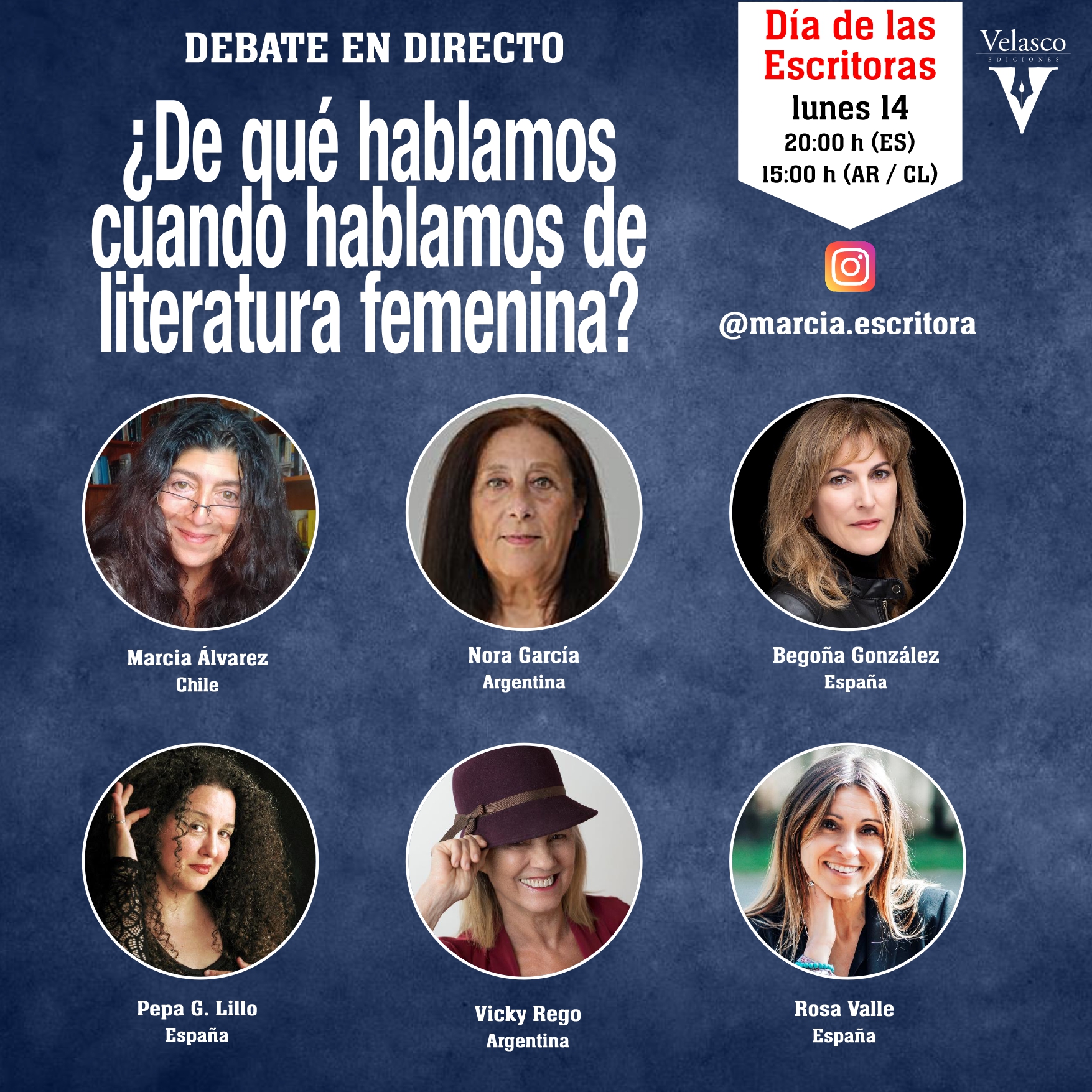Con motivo del Día de las Escritoras, este lunes 14 de octubre, a las 8 de la tarde (hora española), las novelistas Marcia Álvarez (Valparaíso, Chile), Nora C. García (Buenos Aires), Begoña González (Gijón), Pepa G. Lillo (Toledo) y Vicky Rego (Buenos Aires) debatirán en directo en Instagram sobre el concepto y la existencia de la llamada «literatura femenina». El perfil anfitrión es el de Marcia Álvarez (@marcia.escritora), pero se puede seguir desde los perfiles de cualquieras de las autoras mencionadas.