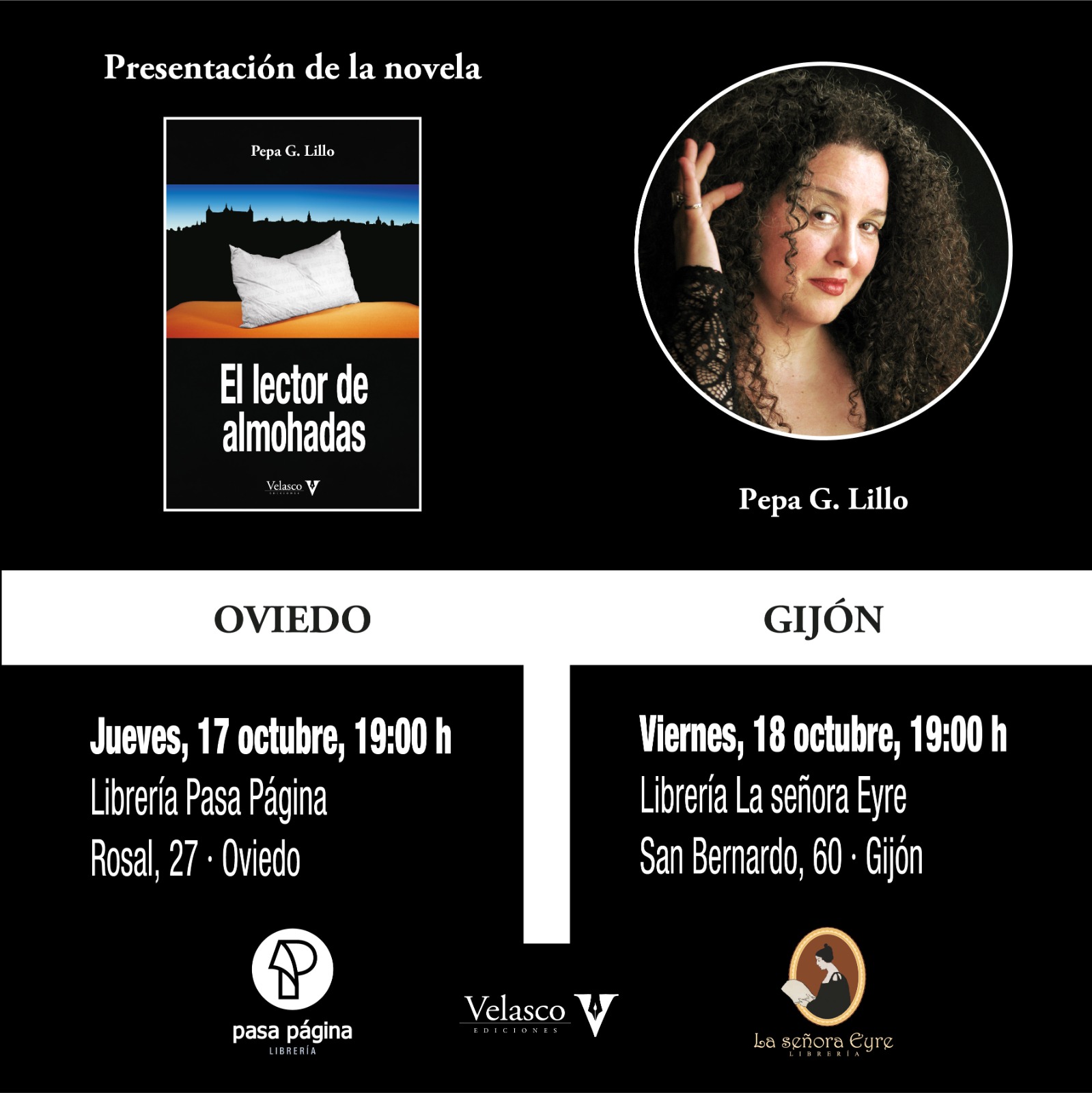 El jueves 17, 19:00 h, será la librería Pasa Página (Rosal 27, Oviedo) quien acoja el encuentro, en el que la autora estará acompañada por su editor Cristian Velasco. El viernes 18, también a las 19:00 h, la novelista, acompañada por Begoña González y también por Cristian Velasco, estará en la librería La señora Eyre (San Bernardo 60, Gijón).